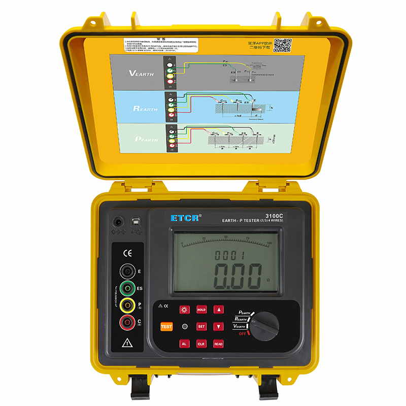 ETCR3100C接地電阻/土壤電阻率測(cè)試儀由主機(jī)、數(shù)據(jù)上傳軟件、測(cè)試線、輔助接地棒、通訊線等組成。儀表外殼采用防水保護(hù)箱,防撞、防摔、防水(防護(hù)等級(jí)IP65)堅(jiān)固安全耐用,儀表還配有大容量可充電鋰電池組,特別適合在戶外工地使用。主機(jī)超大LCD顯示,白屏背光,棒圖指示,一目了然。藍(lán)牙通訊功能,數(shù)據(jù)存儲(chǔ)功能存儲(chǔ)300組數(shù)據(jù),通過(guò)USB接口數(shù)據(jù)上傳軟件實(shí)現(xiàn)歷史查詢與在線實(shí)時(shí)監(jiān)測(cè)功能,動(dòng)態(tài)顯示,告警指示,具有歷史數(shù)據(jù)讀取、查閱、保存、報(bào)表、打印等功能。