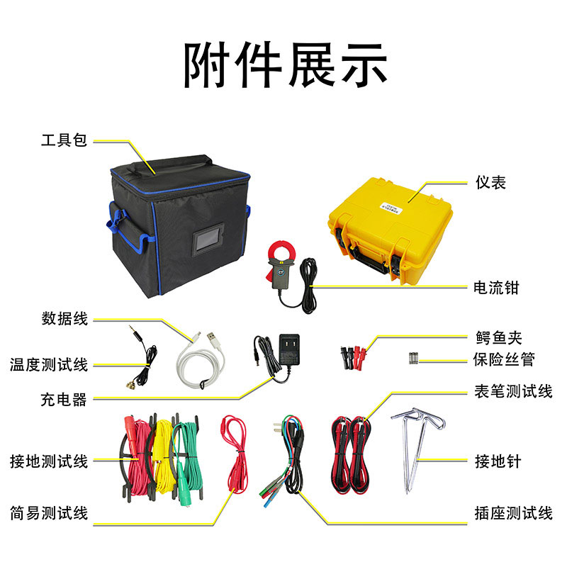 功 能 | 接地電阻測試、絕緣電阻測試、直流電阻測試、RCD漏電保護器測試、電氣插座檢測、電流有效值測試、交流電壓測試、相序測試 |
