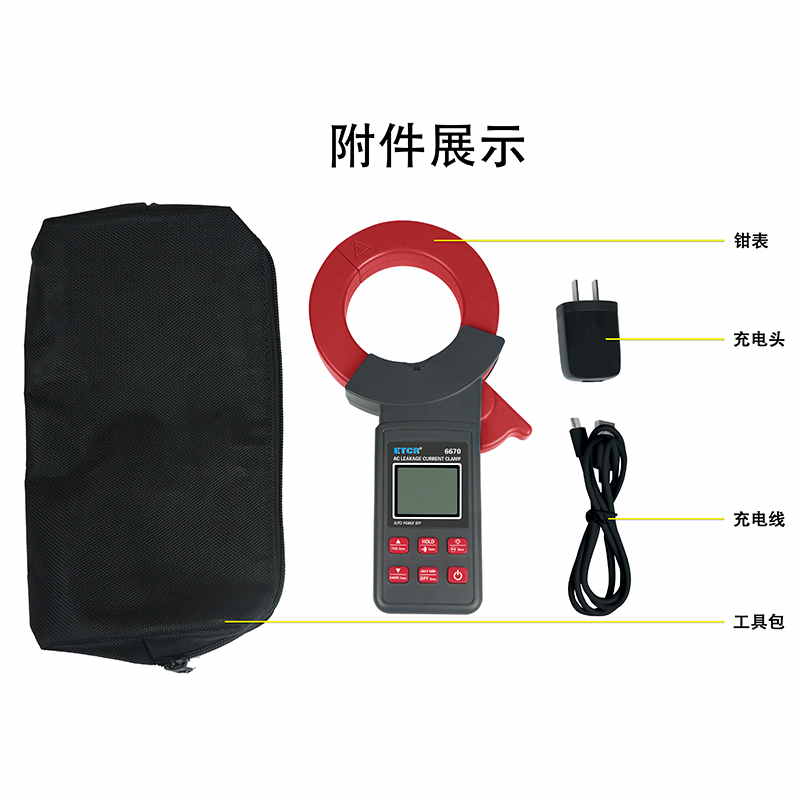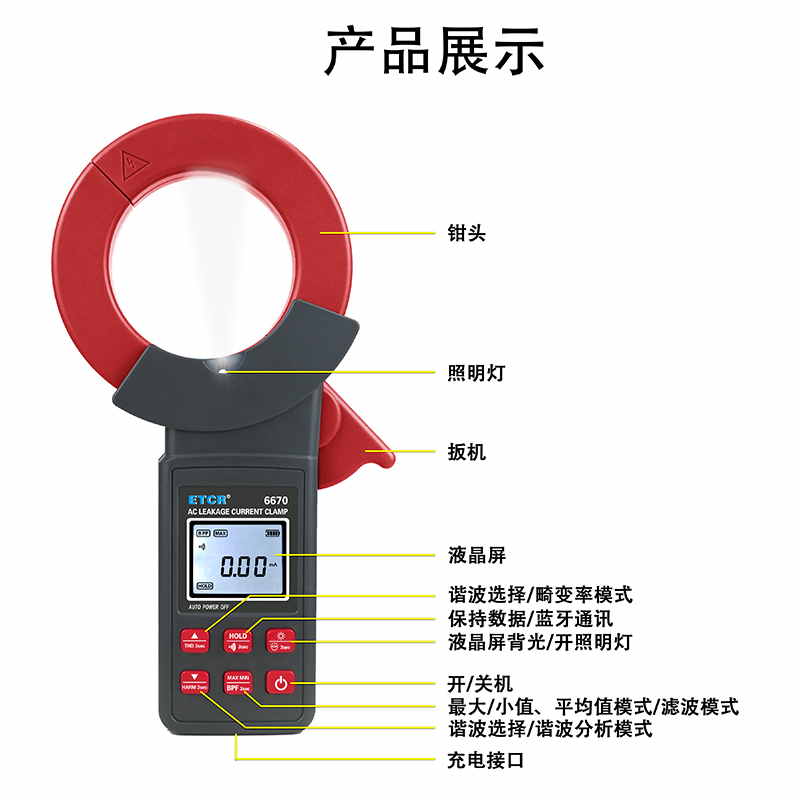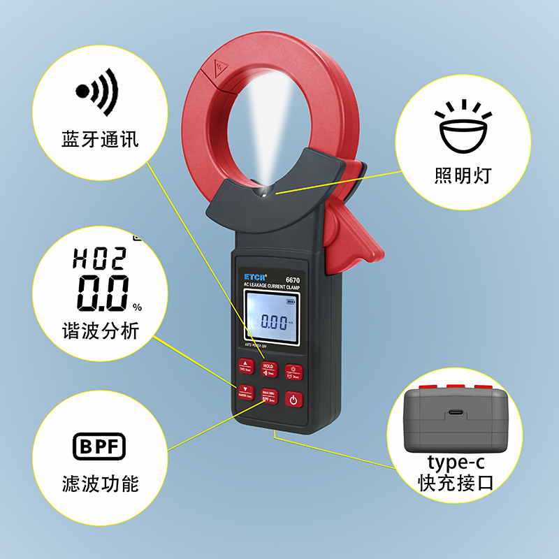 ETCR6670鉗形漏電流表可測試40Hz~1kHz頻率范圍的電流。鉗表還具有背光、手電筒、數(shù)據(jù)存儲(chǔ)、藍(lán)牙通訊等功能。鉗表使用大容量鋰電池type-c充電口,是一款新型的電工安全檢測必備工具。